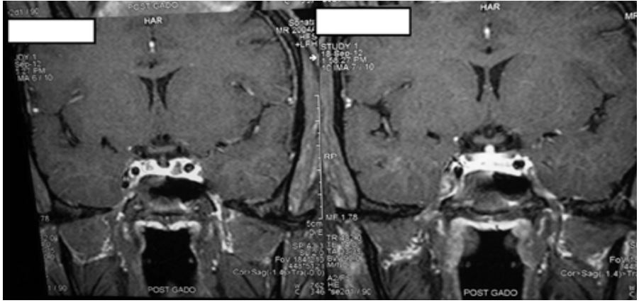 Though her fever and urinary output gradually improved, the shock was persistent for more than 3 days. After ruling out sepsis (TLC 6,000/mm3 , procalcitonin 0.01 ng/ml, sterile blood, and urine cultures), considering her history of amenorrhea (for 9 years) with suspicion of panhypopituitarism, her random cortisol level was sent and found to be abnormal (1 pg/dl). Following which thyroid and other hormonal statuses were sen which were found to be abnormal (free T4 0.50 ng/dl, T3 19.47 ng/dl, TSH-1.24 IU/L, growth hormone < 0.03 ng/ml, prolactin 214 ng/ml, LH 3.21 IU/L, FSH-0.12 IU/L). With the diagnosis of panhypopituitarism, she was started on injection of hydrocortisone 8 mg/hour on DOI-11 (for 3 days) and then tapered off and changed to oral prednisolone with oral thyroxine 50 μg/day tablet according to the endocrinology consultation. Her BP improved and vasopressor (noradrenaline) was tapered off within one day after starting the injection of hydrocortisone. She was discharged on oral prednisolone (10 mg at 8 am, 7.5 mg at 4 pm) and thyroxine (50 micrograms) in good general condition and recovering thrombocytopenia (100,000/mm3 ). In followup, Magnetic Resonance Imaging (MRI) showed an empty sella (Figure 1).